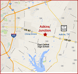 Highway Location: Northside of US Hwy 87 E between Loop 410 & Loop 1604 in the Adkins and China Grove trade area. Across the highway from Chile Verde Mexican Restaurant and just 1.5 miles from East Central High School.