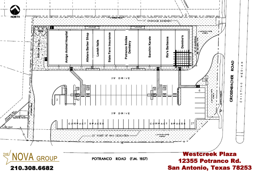 Tenants include: Domino's, Sanchin Karate, Amigo Animal Hospital, Potranco Smiles Dentistry, State Farm Ins., Rios Barbacoa, Lavish Nails, Allstar Barber Shop